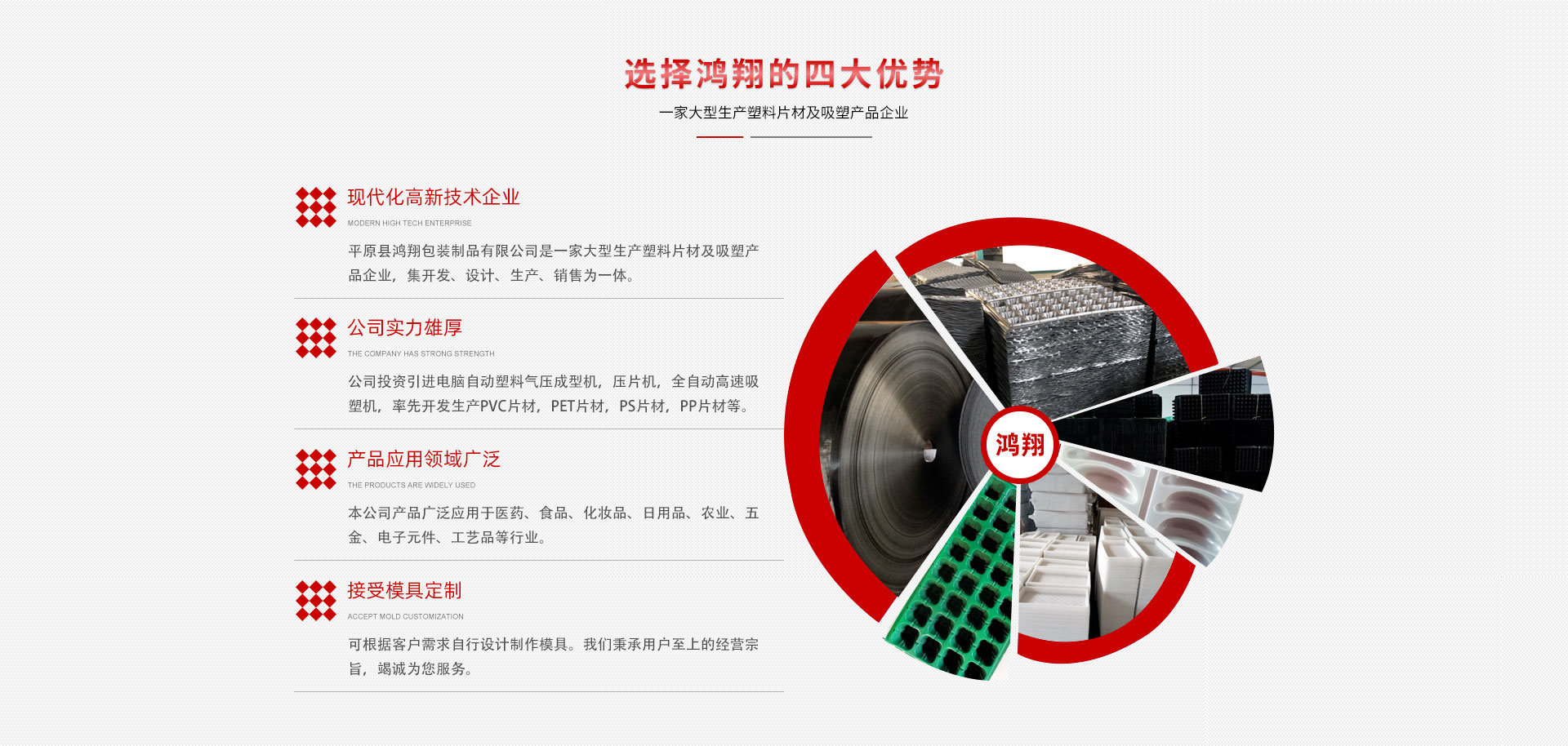 平原縣鴻翔包裝制品有限公司是一家大型生產塑料片材及吸塑產品企業(yè),本公司投資引進電腦自動塑料氣壓成型機,壓片機,全自動高速吸塑機,率先開發(fā)生產PVC片材,PET片材,PS片材,PP片材等,鴻翔是國內先進的生產廠家之一。本公司產品廣泛應用于醫(yī)藥、食品、化妝品、日用品、農業(yè)、五金、電子元件、工藝品等行業(yè),也可根據(jù)客戶需求自行設計制作模具。本公司技術力量雄厚,生產設備工藝先進。我們秉承用戶至上的經營宗旨,竭誠為您服務。